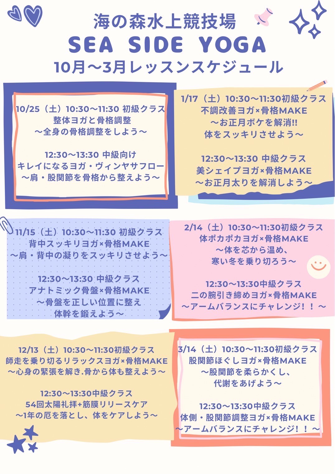 | 12月13日(土) | 10:30~11:30 | 【初級者向け】美姿勢ヨガ+骨格調整 〜全身を整えて新年を迎えましょう〜 |